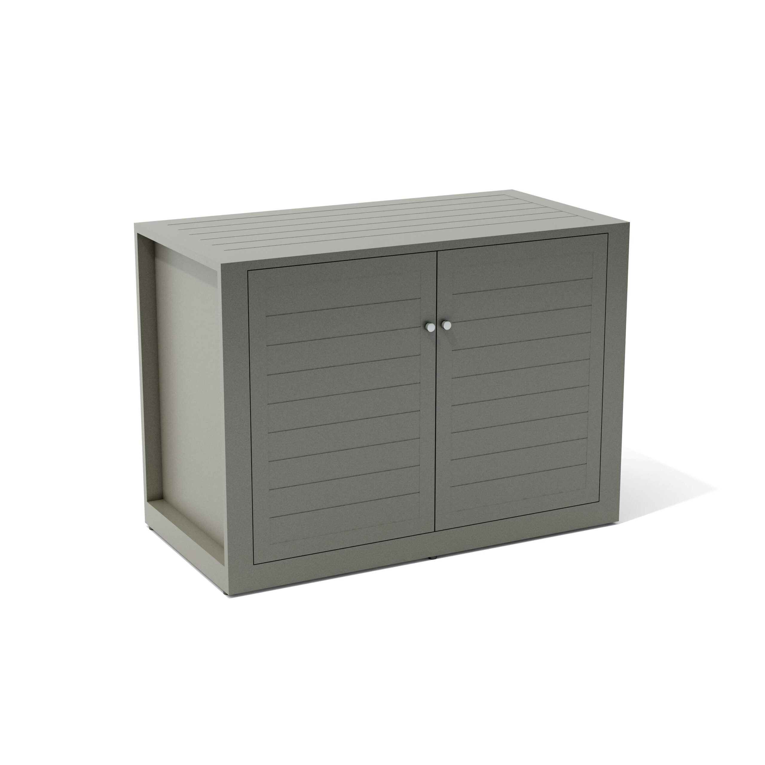 - Cabinet includes two closed cabinets with hinged doors and hardware, one pull out drawer with hardware, one multi-purpose flip top compartment with two buckets (for ice, etc.).