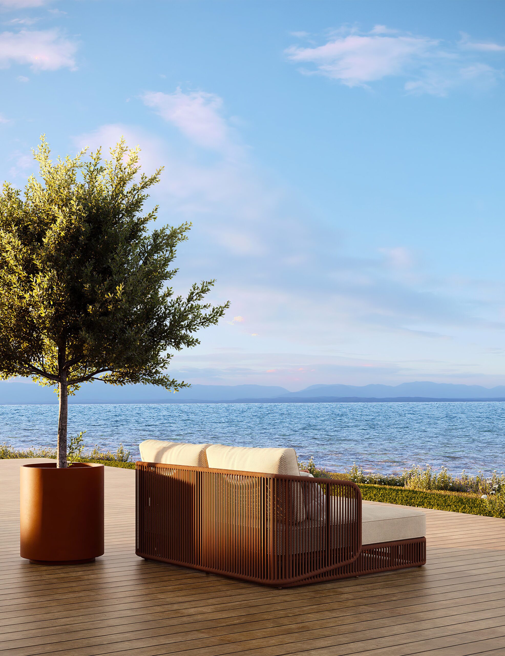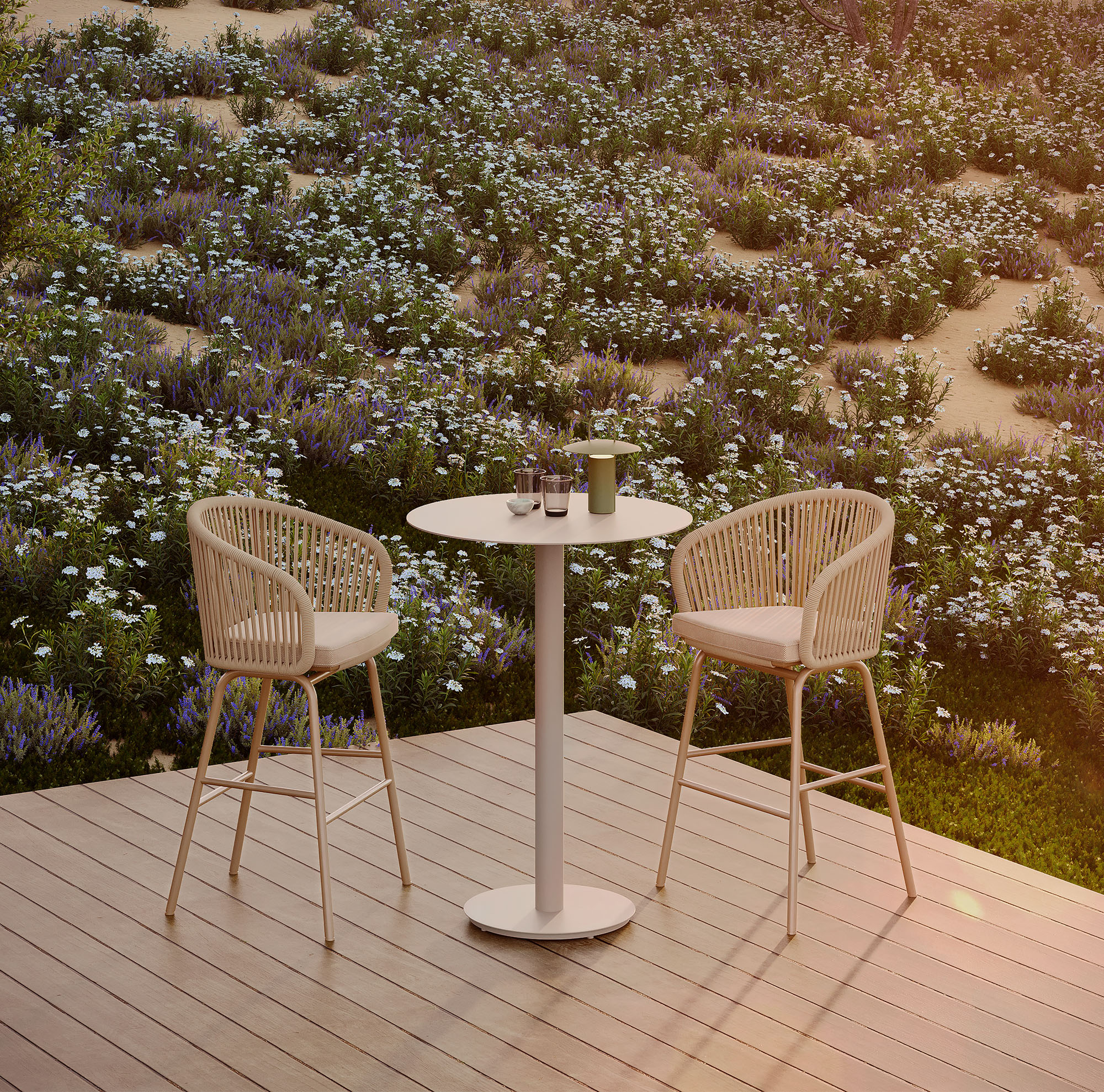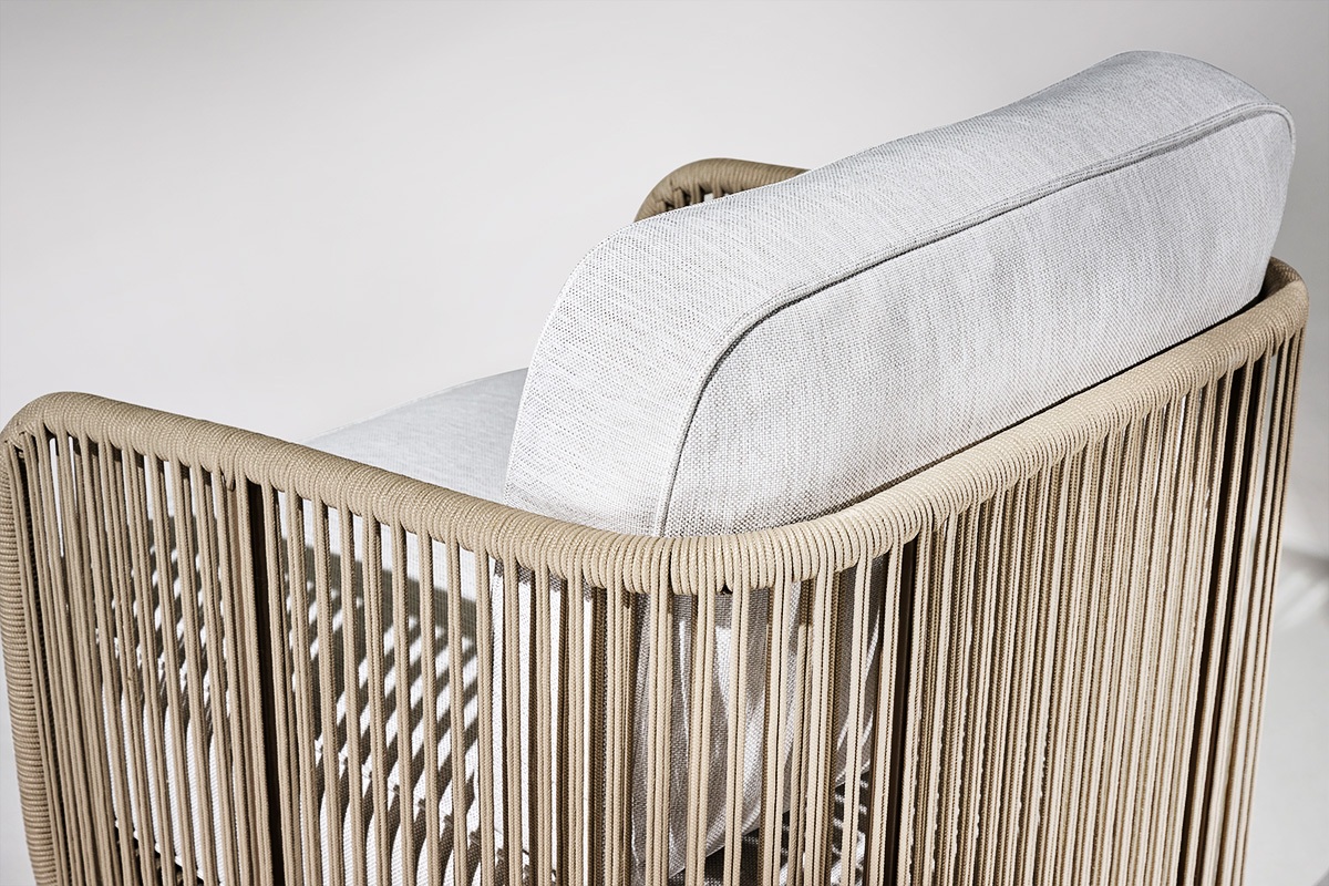 Wainscott collection features handwoven, all-weather rope in powerful vertical lines. Designed with natural spaces in mind, its rhythmic repetition mimics the surrounding landscape and seamlessly integrates into indoor and outdoor settings. The collection includes seating options for lounging and dining, with a versatile and sophisticated design