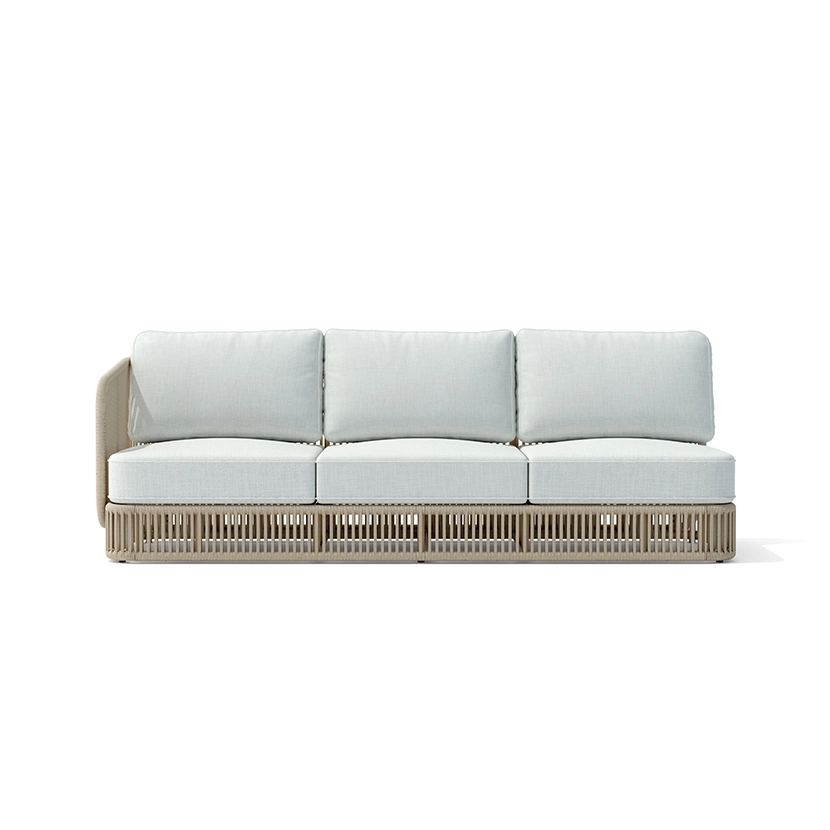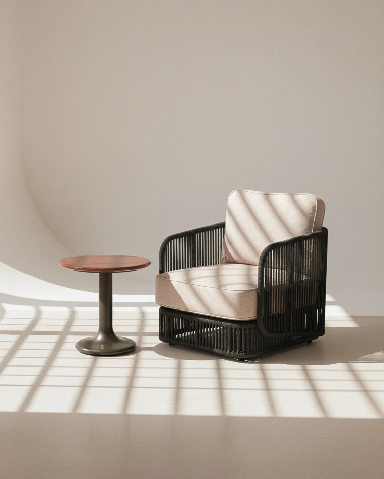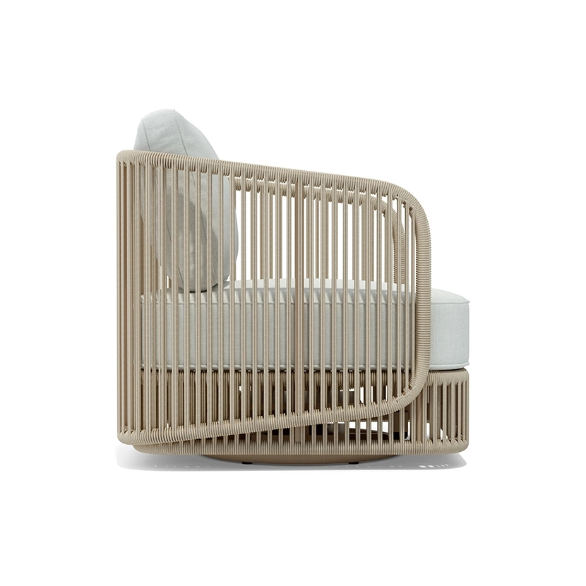 Wainscott collection features handwoven, all-weather rope in powerful vertical lines. Designed with natural spaces in mind, its rhythmic repetition mimics the surrounding landscape and seamlessly integrates into indoor and outdoor settings. The collection includes seating options for lounging and dining, with a versatile and sophisticated design