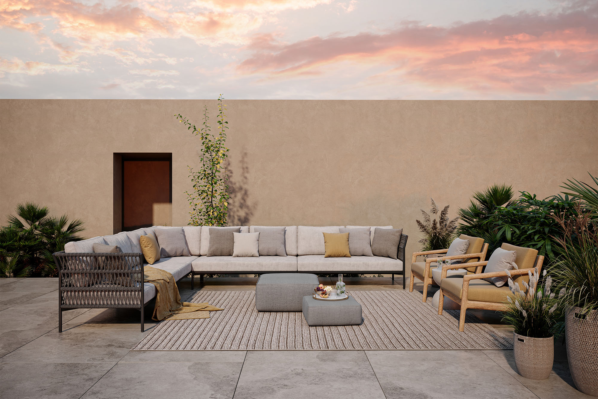 - Cushion set is available in our own premium Giati Elements fabric, in all Sunbrella fabrics or COM. Zippers are corrosion resistant.