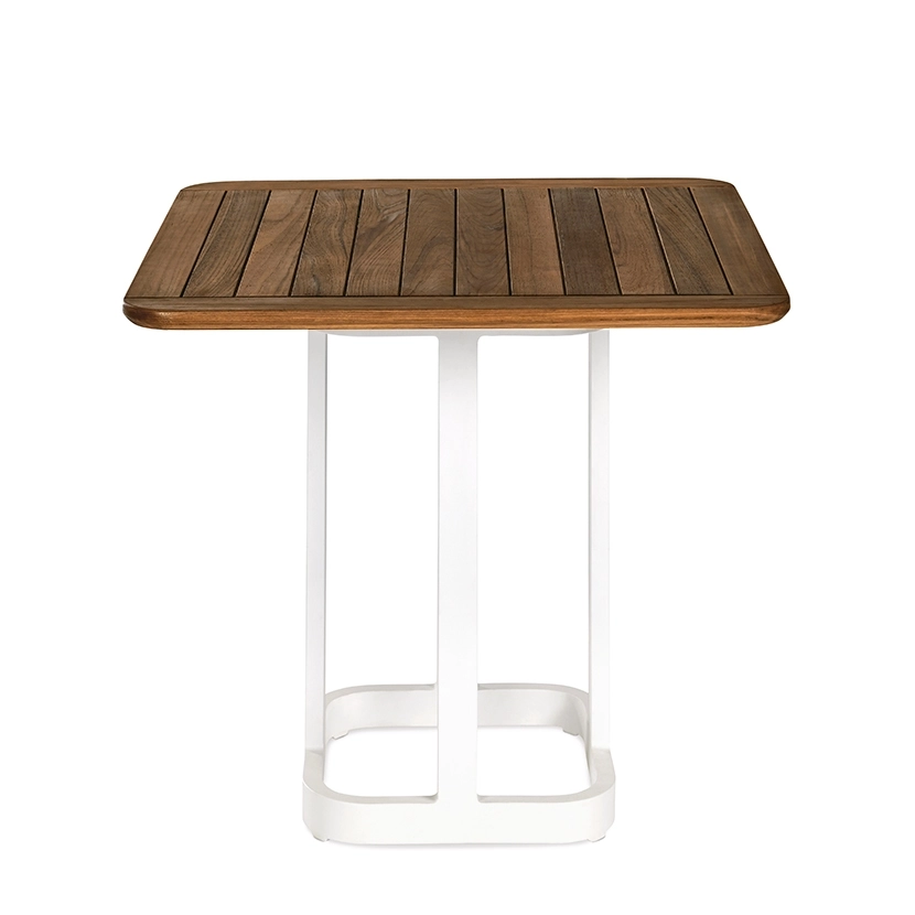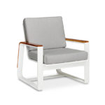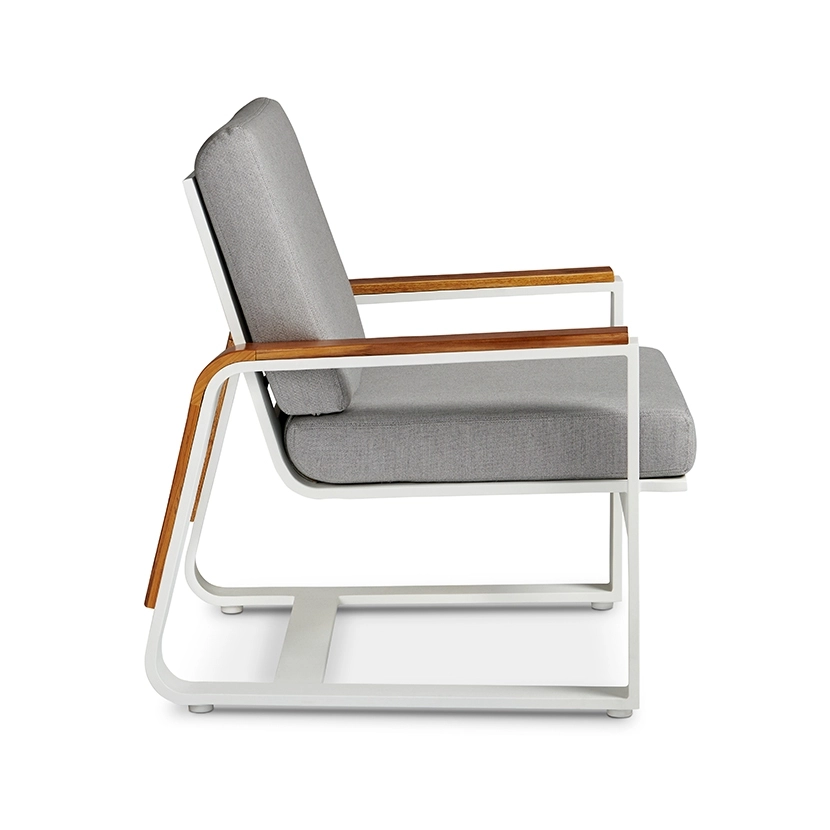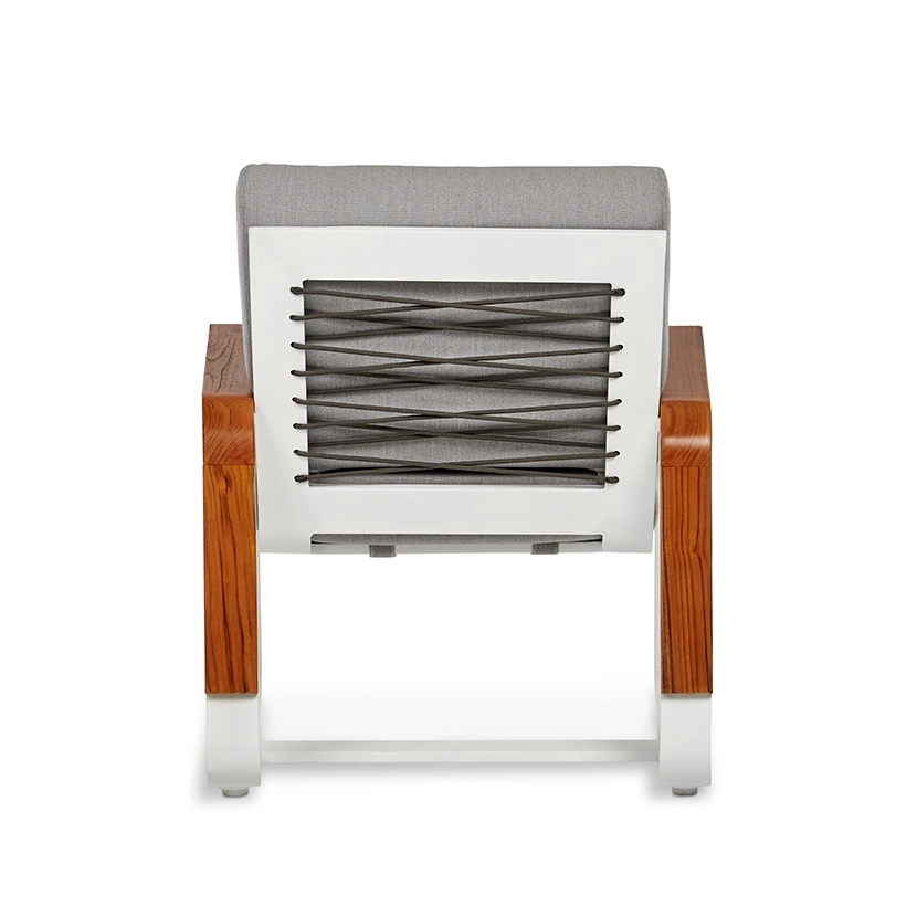 - Frame designed in a durable powder coated aluminum with arm accents in premium teak. Unfinished Teak will weather naturally and change color over time due to exterior elements. Review our Teak Care and Maintenance for more information. Faux teak trim (aluminum) option also available, please inquire.