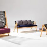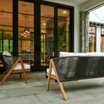 Topped with plush cushions, these elements offer an interesting visual contrast to the sleek, angular frames. These wood structures feel reminiscent of A-frame style architecture, which is popular among modernists in forested and mountainous areas due to their simple, geometric, rustic appeal. Together, these design elements strike a sense of balance for a polished, high-design feel.