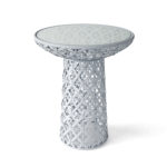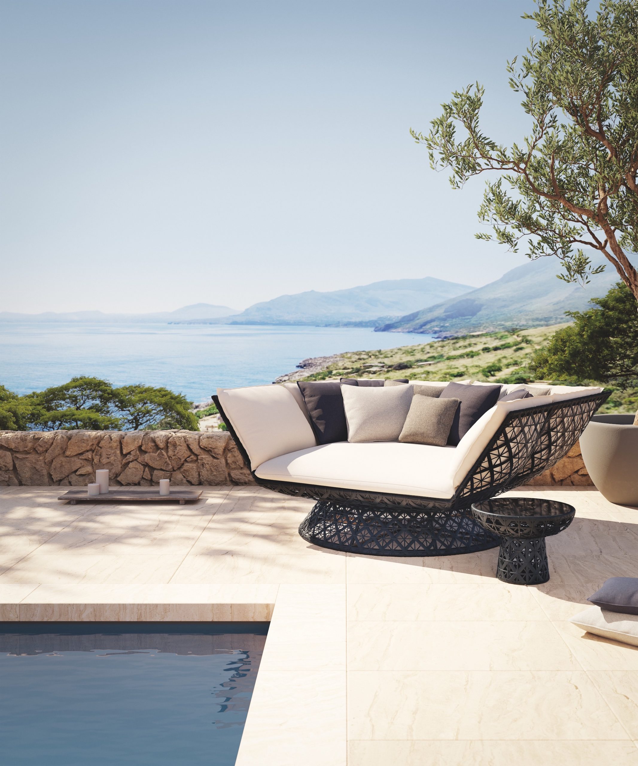 With its ornamented pattern, the pieces can be customized while pillows create a cozy atmosphere. Side tables and coffee tables complete this set that envelopes people in modern tranquility while offering them a sense of security and the freedom to dream.