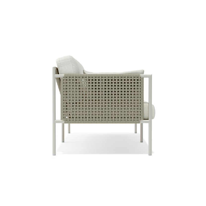 Like the mast of a sailboat, the collection’s reinforced powder coated aluminum frames and double wall rope-pane structures marry the lasting strength of metal with the trusted hand of knotted rope.
