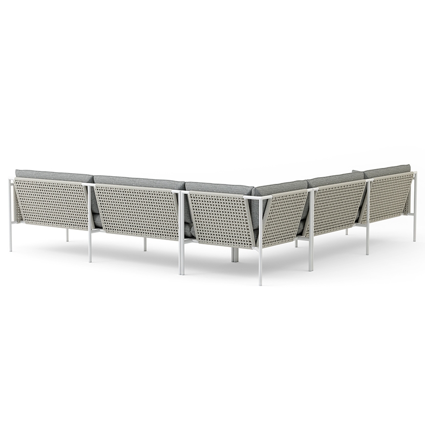 Like the mast of a sailboat, the collection’s reinforced powder coated aluminum frames and double wall rope-pane structures marry the lasting strength of metal with the trusted hand of knotted rope.