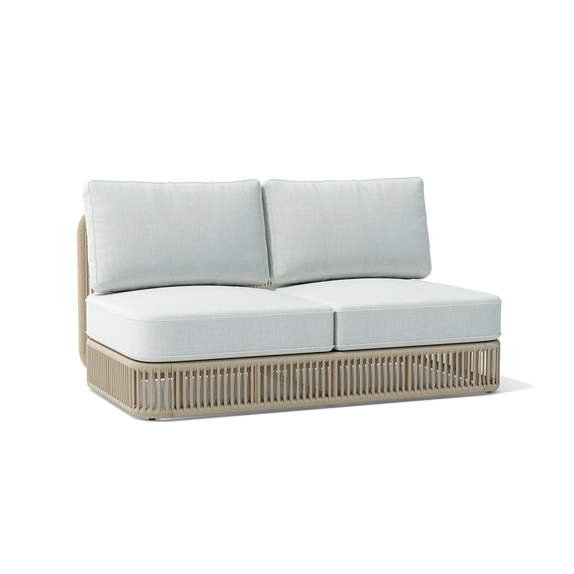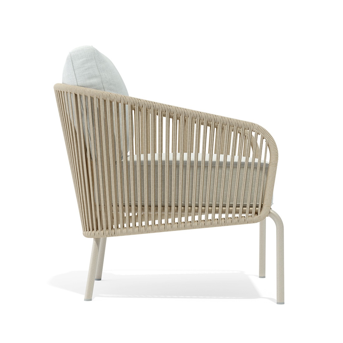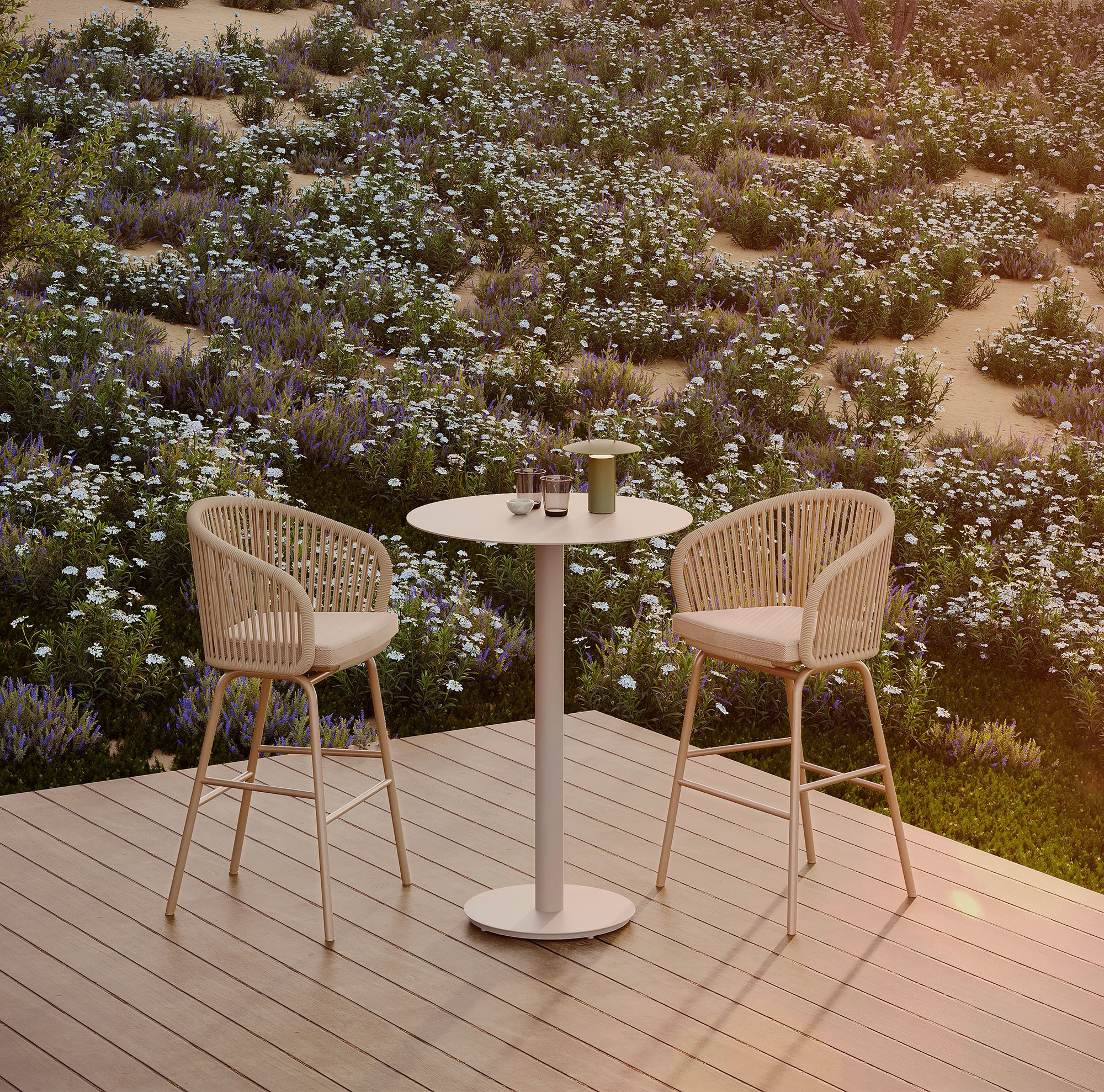 We designed this collection for natural spaces. The woven rope blends seamlessly into your outdoor setting. Its vertical lines mimic tall trees and wild grasses. Sunlight and shadow play beautifully across the woven frames. This effect perfectly mirrors the surrounding landscape at sunset.
