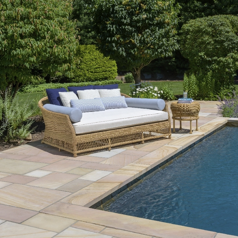 - Frame designed in a durable powder coated aluminum and wrapped in an all-weather outdoor rattan resin