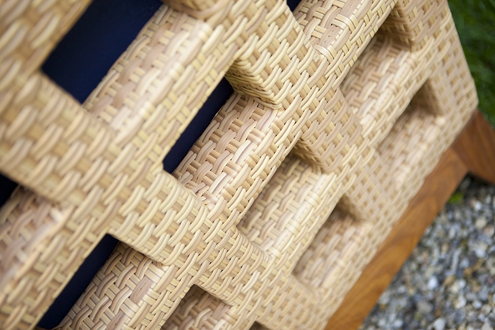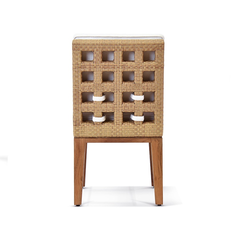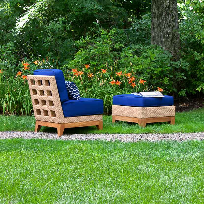 Crafted with a commitment to quality, the Aperture Collection features powder-coated aluminum frames covered in woven resin peel for a refined and tactile finish. The carved teak legs add natural warmth and character to the crisp shapes, grounding the collection with an inviting charm.