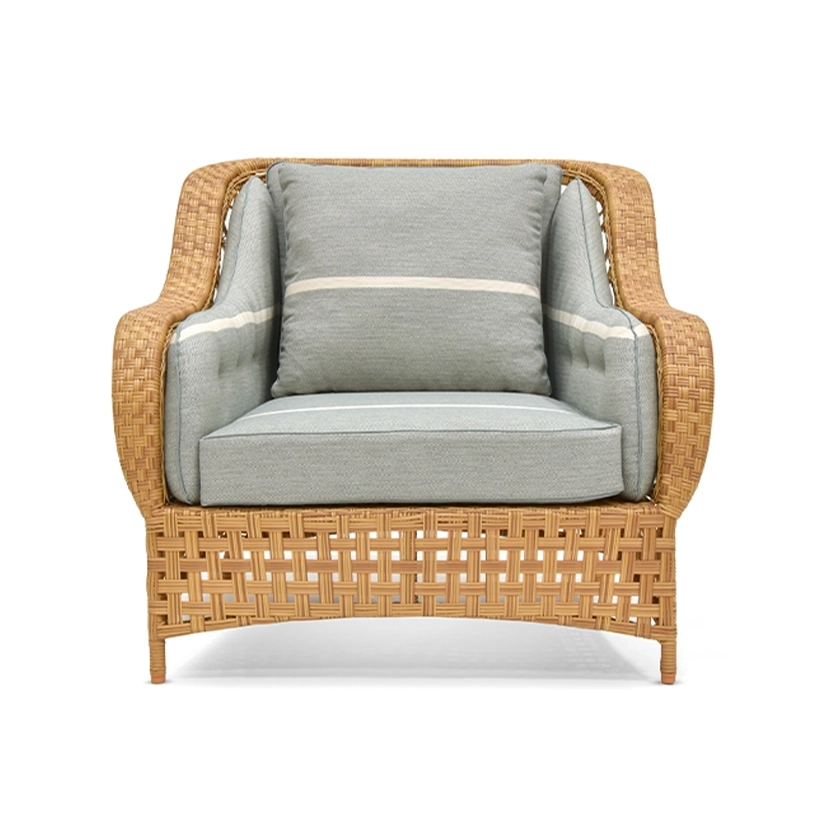 The mixed resin weave—featuring a blend of round and semi-flat strands—adds rich texture and visual depth, enhancing the collection’s tactile and aesthetic appeal. Finished with broad, cascading armrests, each piece exudes a regal presence that anchors and elevates any outdoor seating area.