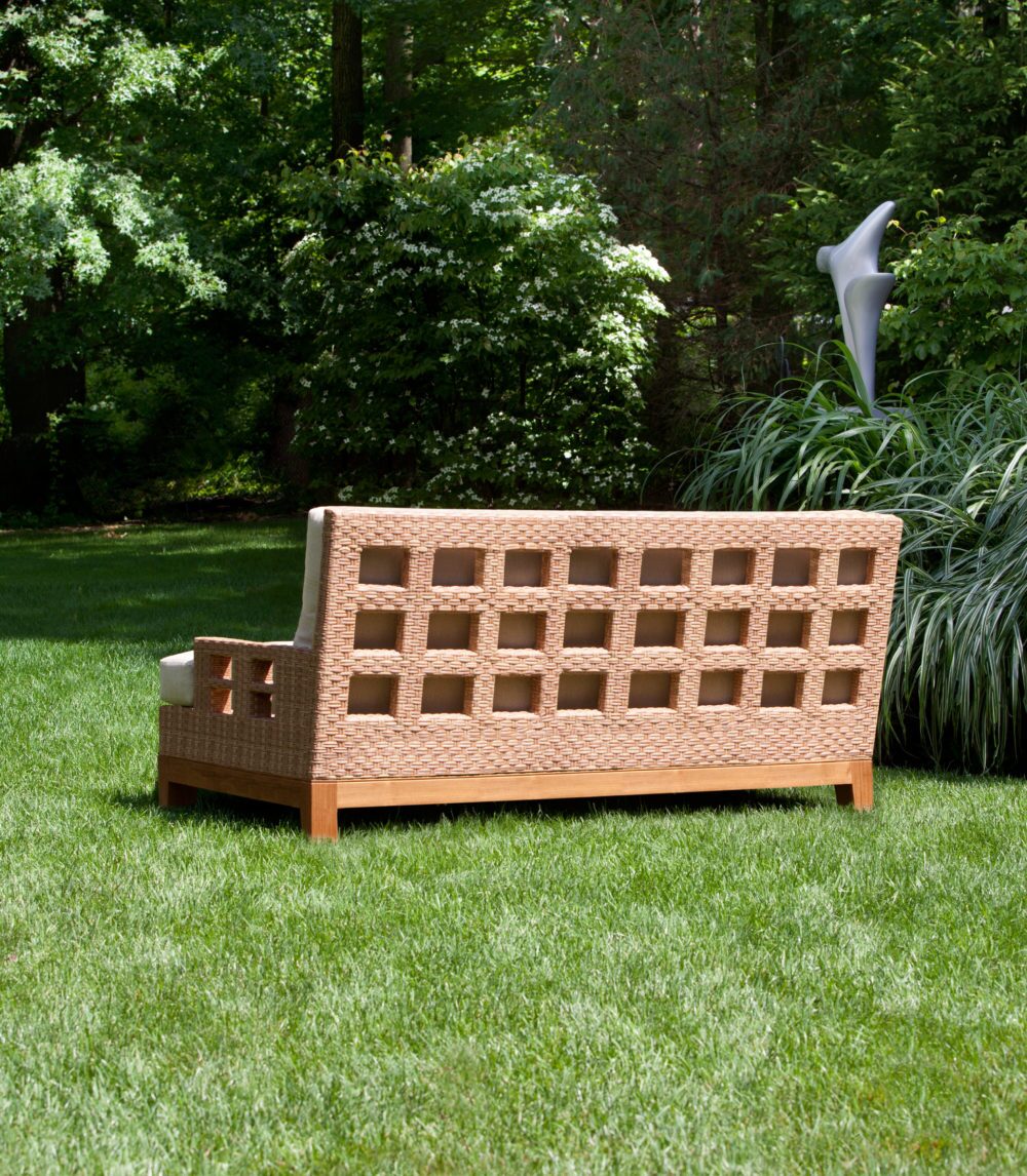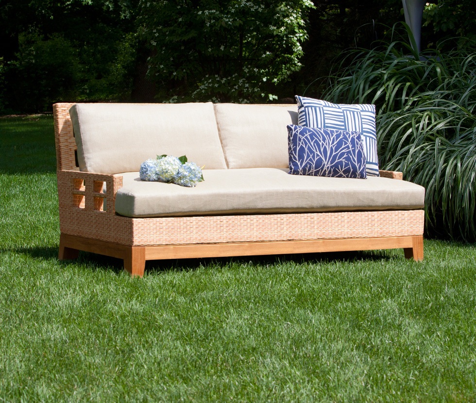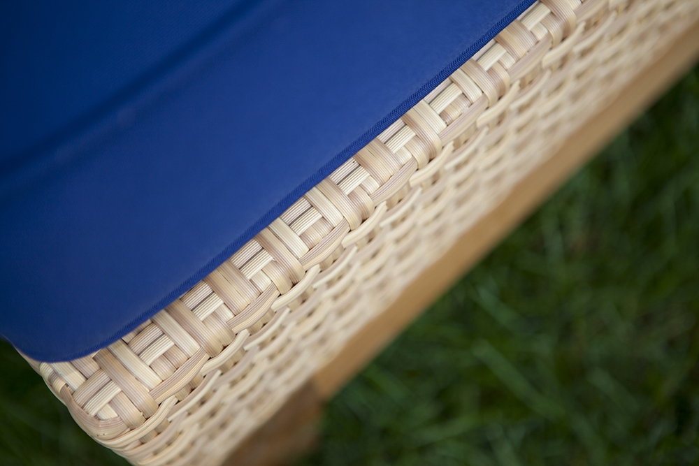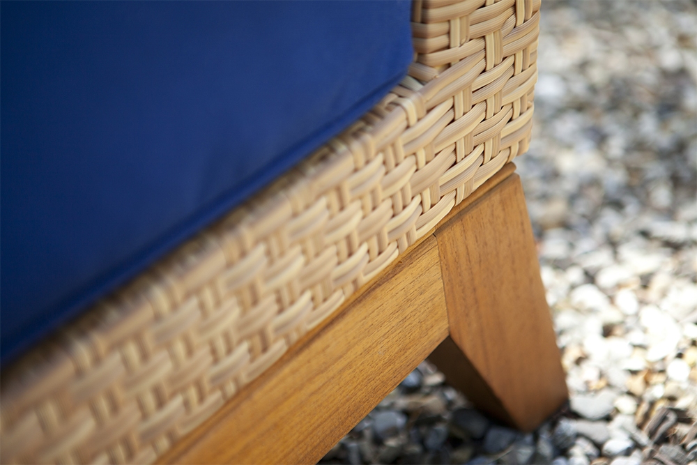 - Internal frame designed in a durable powder coated aluminum and wrapped in an all-weather semi-flat resin on natural teak feet.