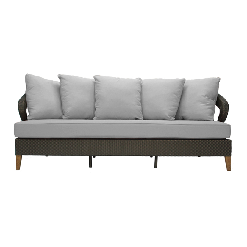 - Internal frame designed in a durable powder coated aluminum and wrapped in an all-weather flat resin weave on natural teak feet.
