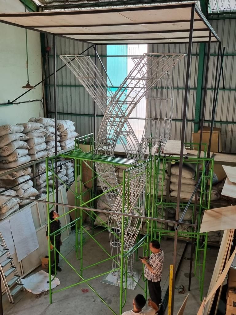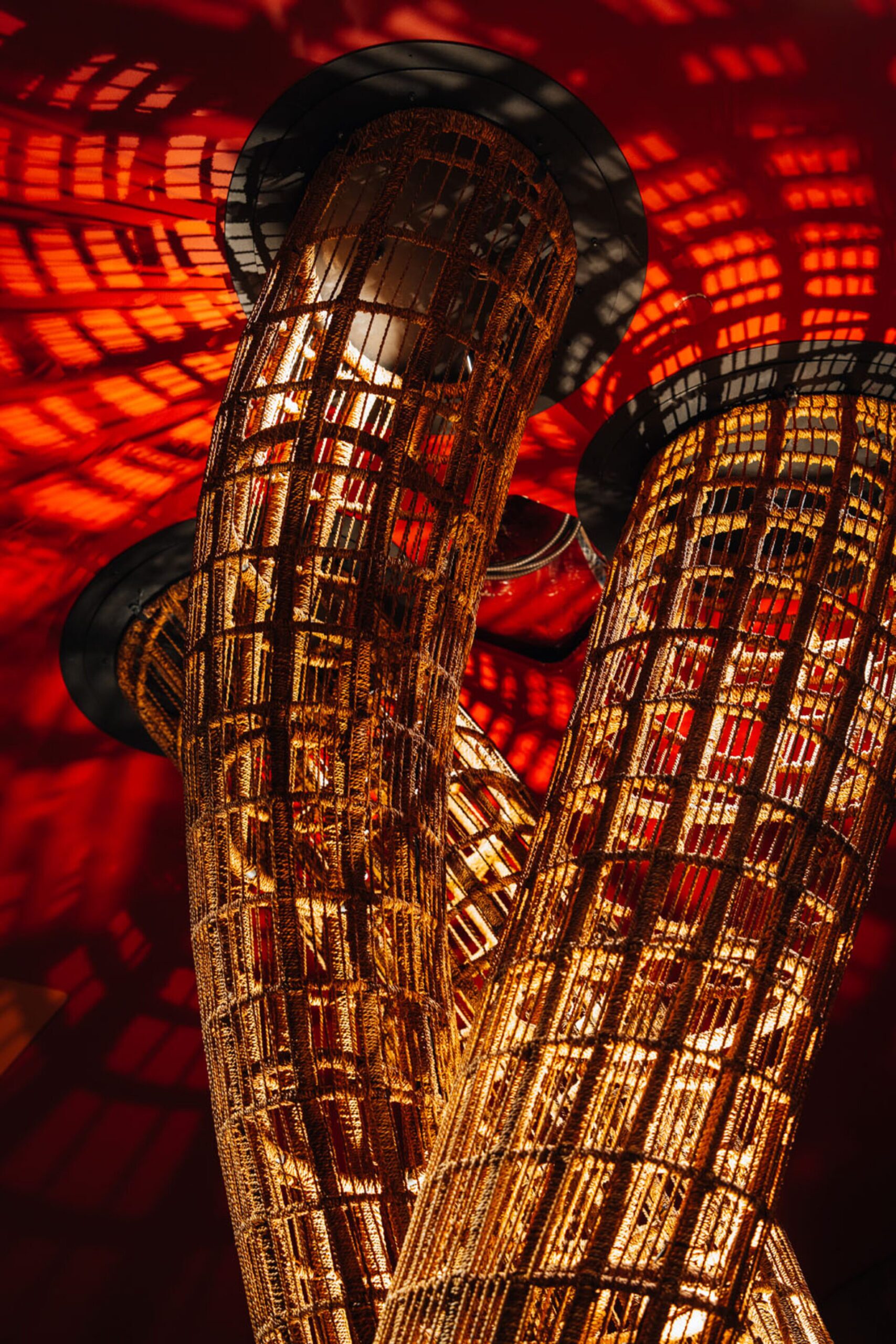 Description: Dragon Tail decorative sculptures, woven in natural abaca rope with integrated LED lighting